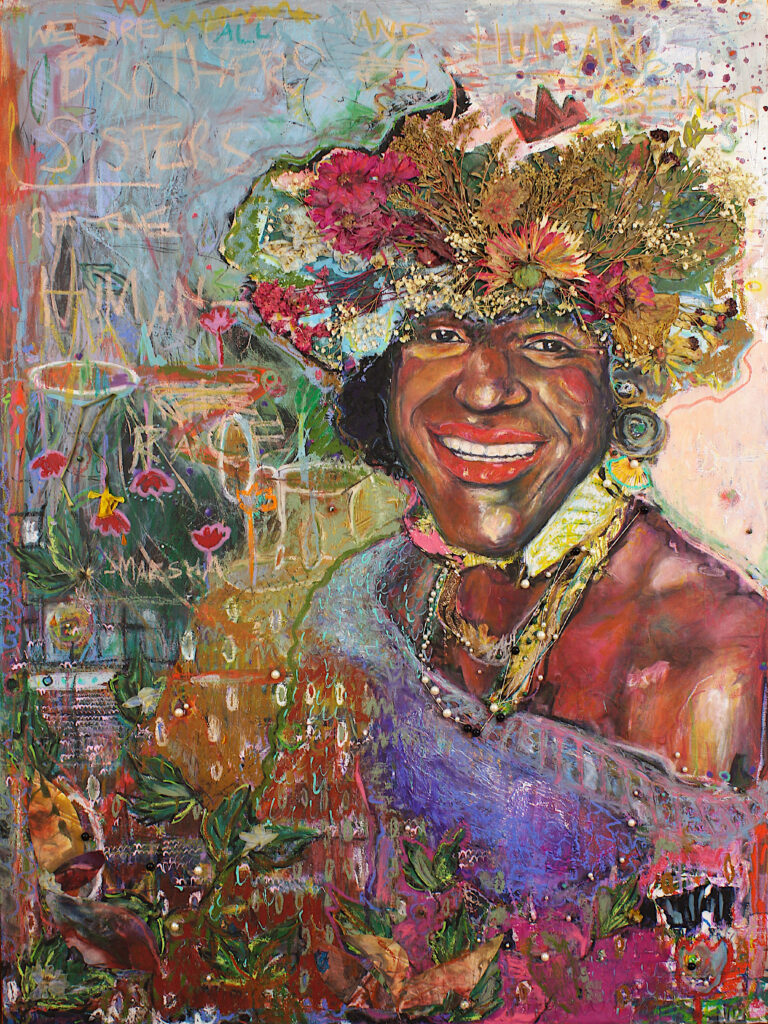 Artist’s notes about the piece: Marsha took over a year to complete and was created with the help of my (at the time) five year old son and my three year old daughter. They had painted an underpainting on a large canvas when they were about three and one and a half years old and I saved it, waiting for the right time to use it. Fast forward about a year, I was on a lunch date with my son and we sat near a trans woman, sparking a conversation about identity, love, and acceptance. This moment made me reflect on the importance of creating space for my children’s questions, to ensure they feel safe to be whoever they are, and to teach them to also create safe spaces for the people around them. Soon after, we began learning together about the Pride movement and those who fought for rights and those who continue to do so. When we came across this photo of Marsha and her story I KNEW this was meant to be on our canvas I had saved for so long. Together we spent almost another year creating this artwork, it’s a memory I will cherish forever and I pray has helped to deepen love, empathy, and support within my children.